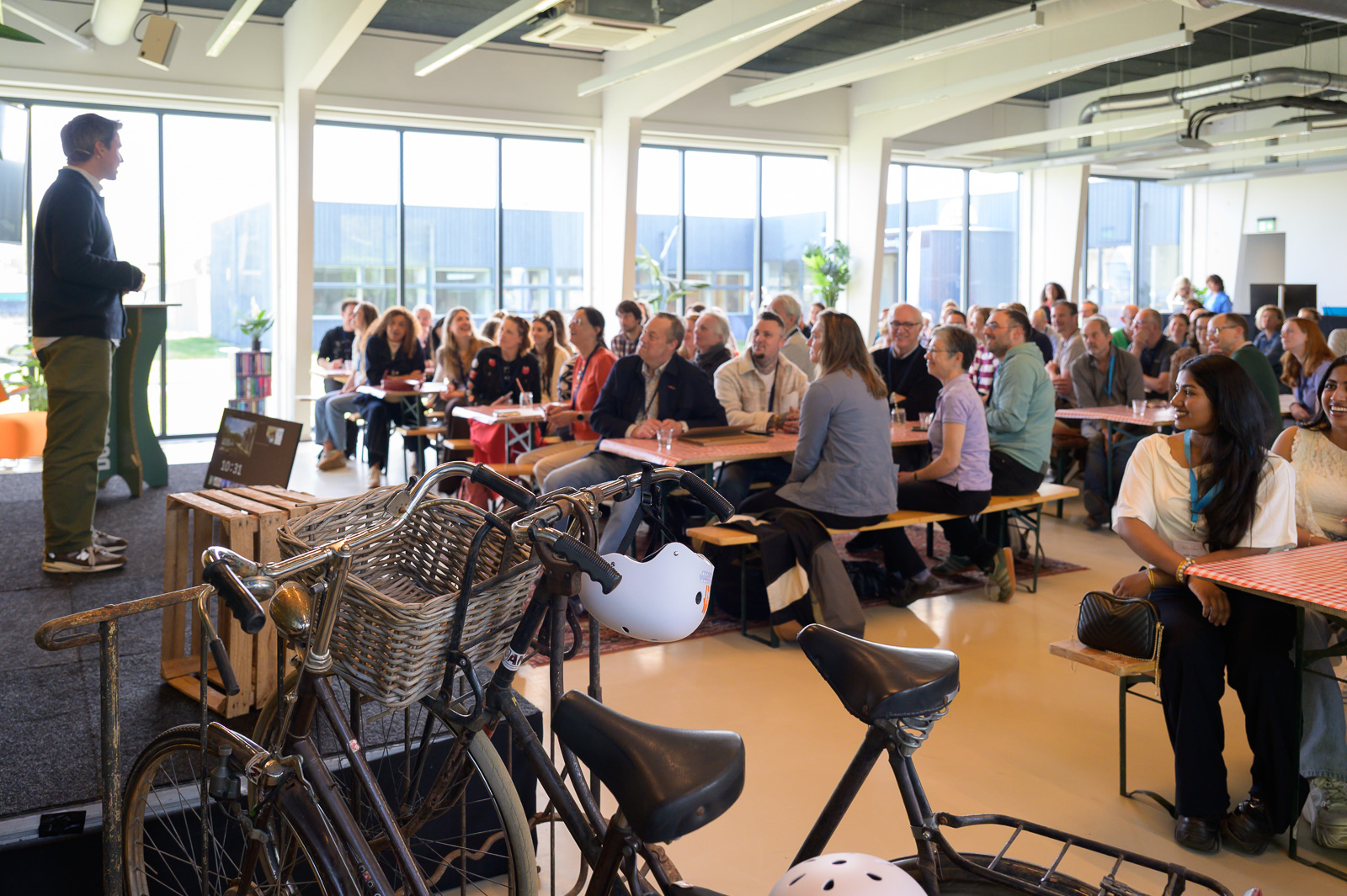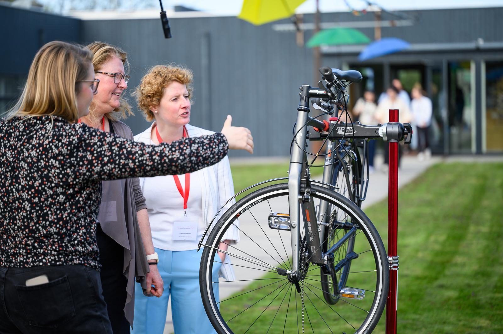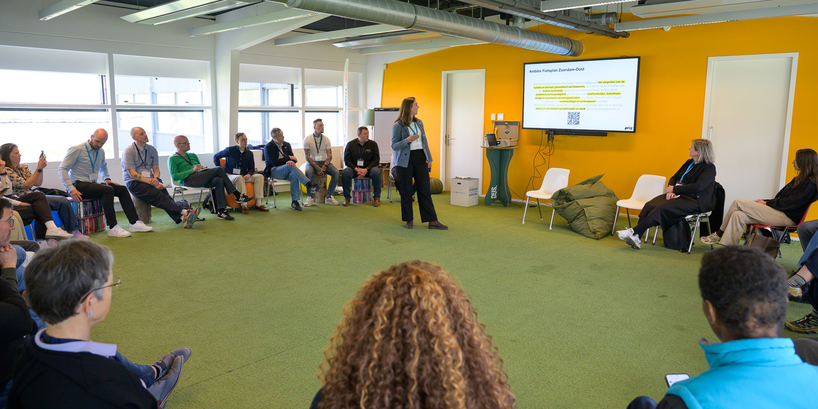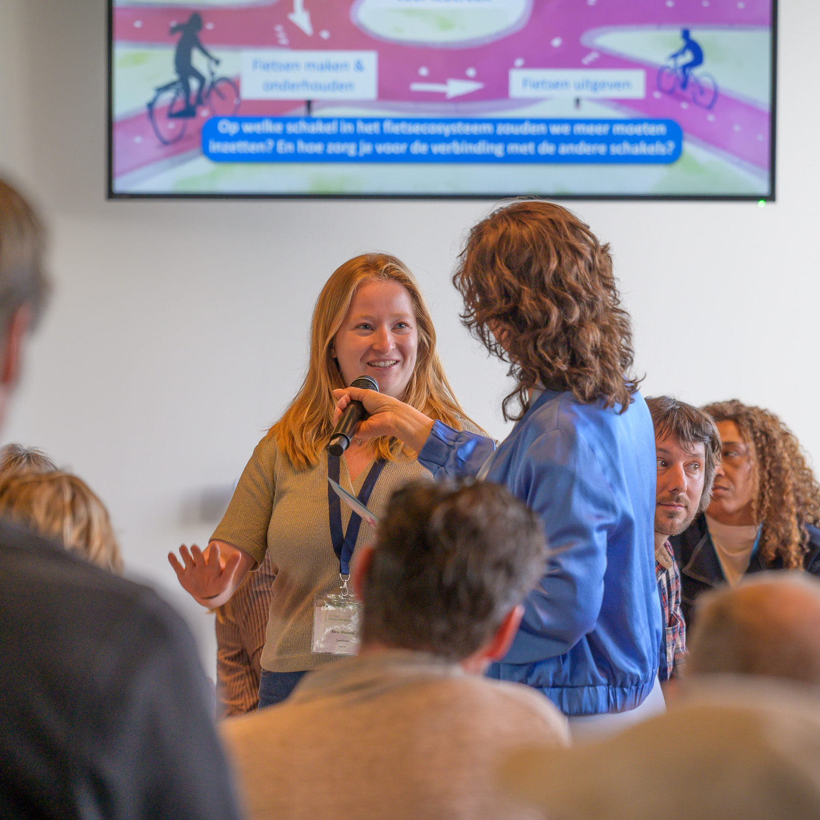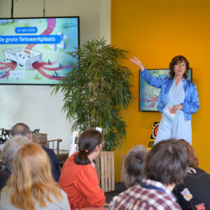 Nadat programmamanager en dagvoorzitter Monique Verhoef achter op de fiets de zaal is binnengereden, trapt ze De grote fietswerkplaats af met wat inventariserende vragen:
