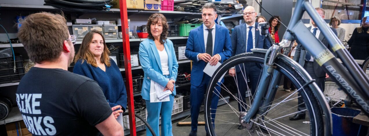 Verder tijdens het werkbezoek vertelde fietstechnicus en leermeester Patrick Hardeman in de werkplaats hoe mensen via dagbesteding leren fietsen repareren en soms zelfs doorgroeien tot fietsenmaker. Thomas Schreurs van de sociale onderneming BikeWorks deelde hoe hij ooit in het depot begon en nu zelf jongeren begeleidt.